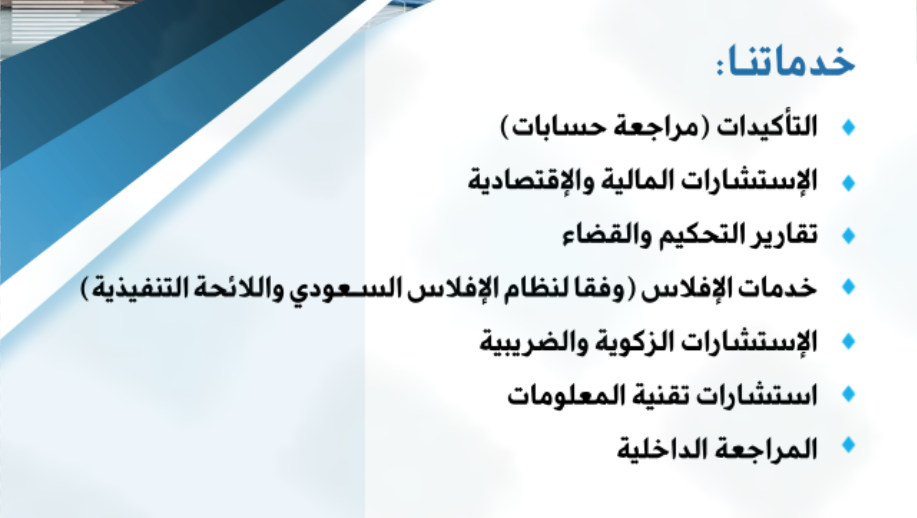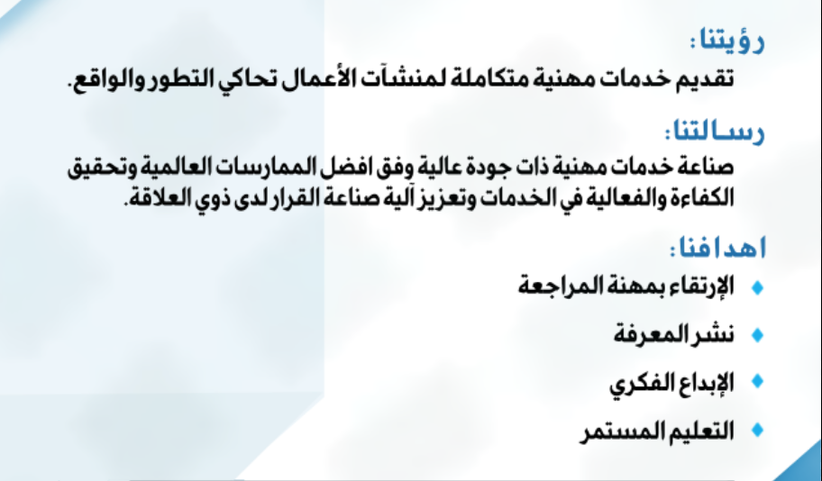 تتمتع الشركة بخبرات طويلة من خلال مراجعة حسابات مجموعة كبيرة من الشركات بأشكالها المتنوعة والمصانع والمؤسسات الفردية بالإضافة إلى المؤسسات والهيئات العامة الحكومية والمنظمات الدولية. وقد غطت أعمالنا كافة مجالات الأنشطة التجارية ، الصناعية، الزراعية، والخدمية. وفي مجالات الاستشارات فقد قامت الشركة بتقديم خدمات عديدة