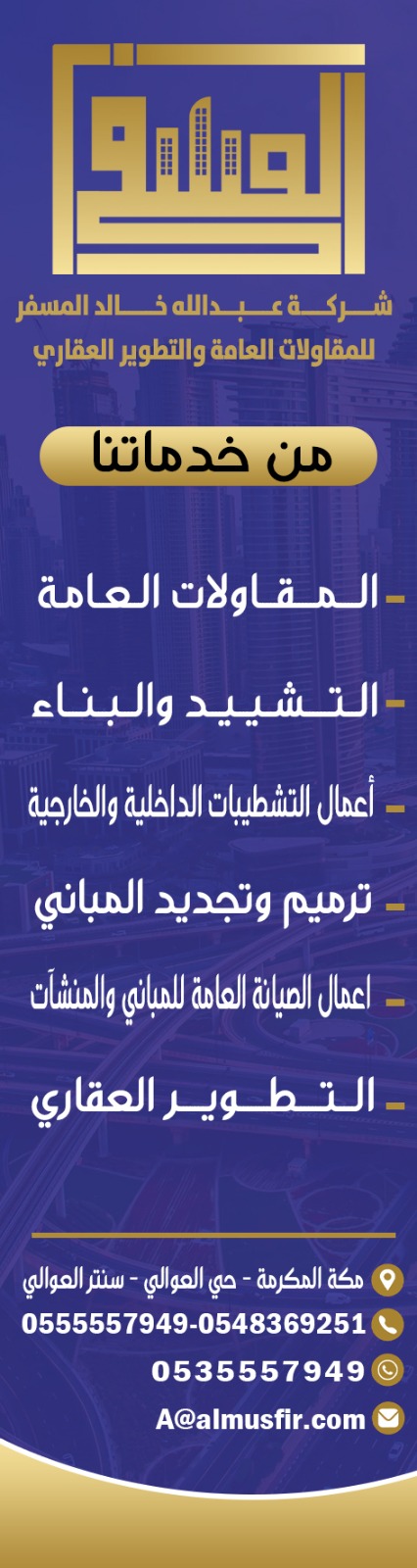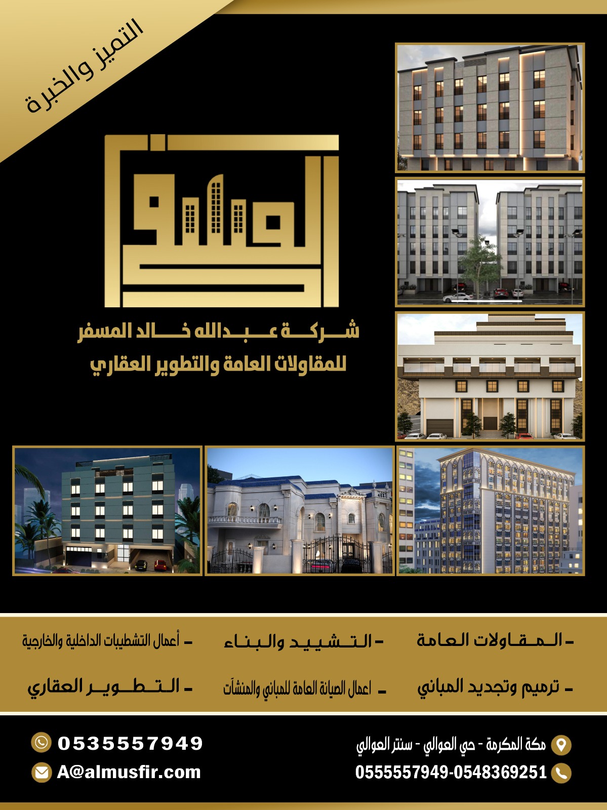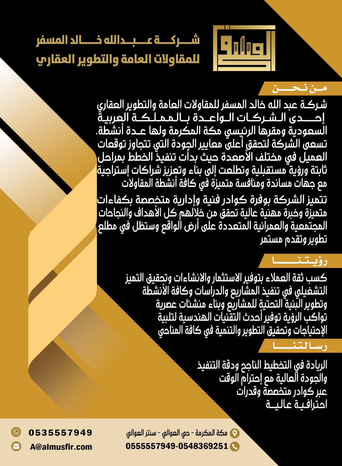شركة عبد الله خالد المسفر للمقاولات العامة والتطوير العقاري إحدى الشركات الواعدة بالمملكة العربية السعودية ومقرها الرئيسي مكة المكرمة ولها عدة أنشطة. تسعى الشركة لتحقق أعلى معايير الجودة التي تتجاوز توقعات العميل في مختلف الأصعدة حيث بدأت تنفيذ الخطط بمراحل ثابتة ورؤية مستقبلية وتطلعت إلى بناء وتعزيز شراكات إستراجية مع جهات مساندة ومنافسة متميزة في كافة انشطة المقاولات تتميز الشركة بوفرة كوادر فنية وإدارية متخصصة بكفاءات متميزة وخبرة مهنية عالية تحقق من خلالهم كل الأهداف والنجاحات -المجتمعية والعمرانية المتعددة على أرض الواقع وستظل في مطلع تطوير وتقدم مستمر