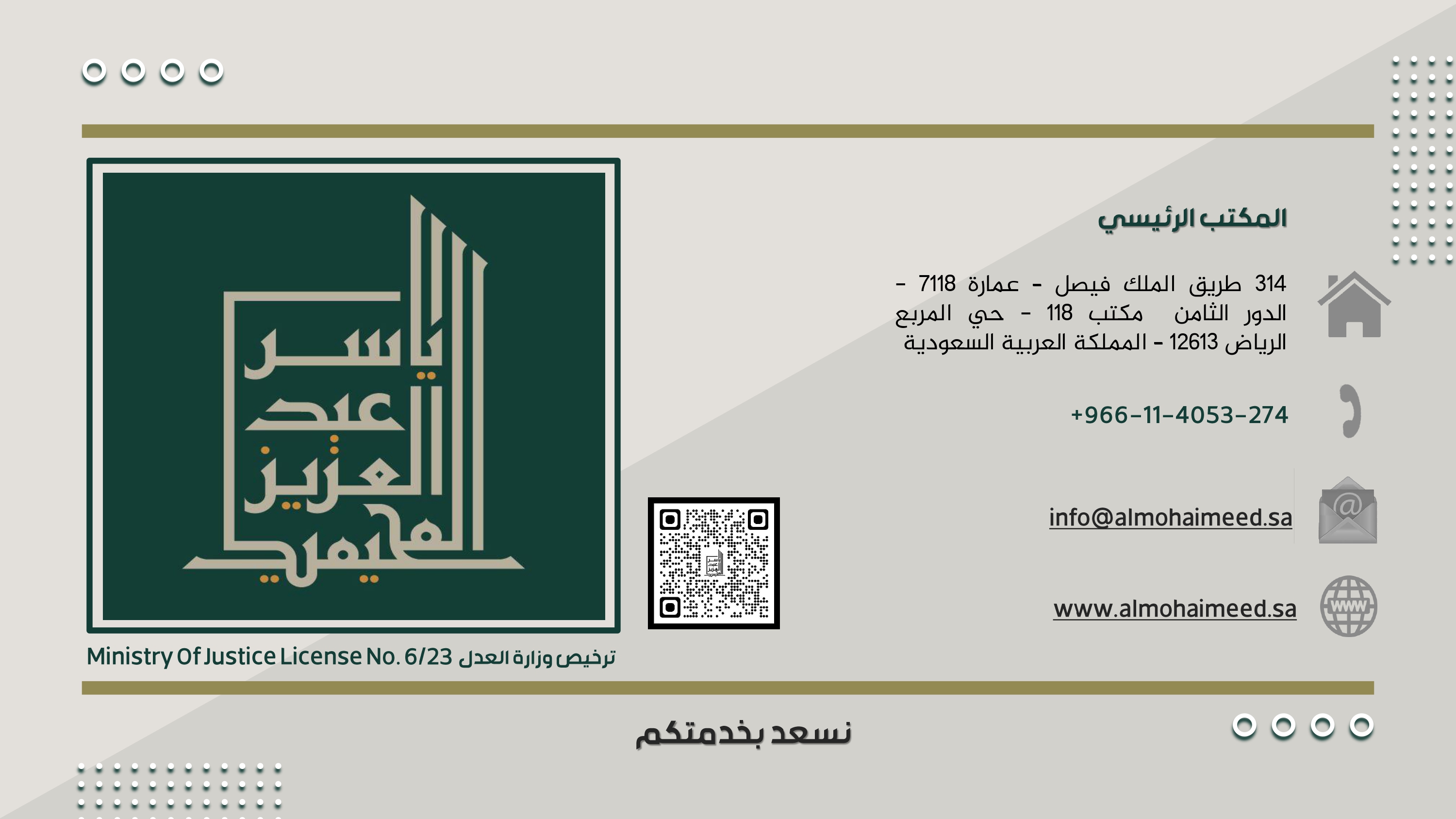 الرياض , طريق الملك فيصل - عمارة 7118 الدور الثامن مكتب 118 حي المربع