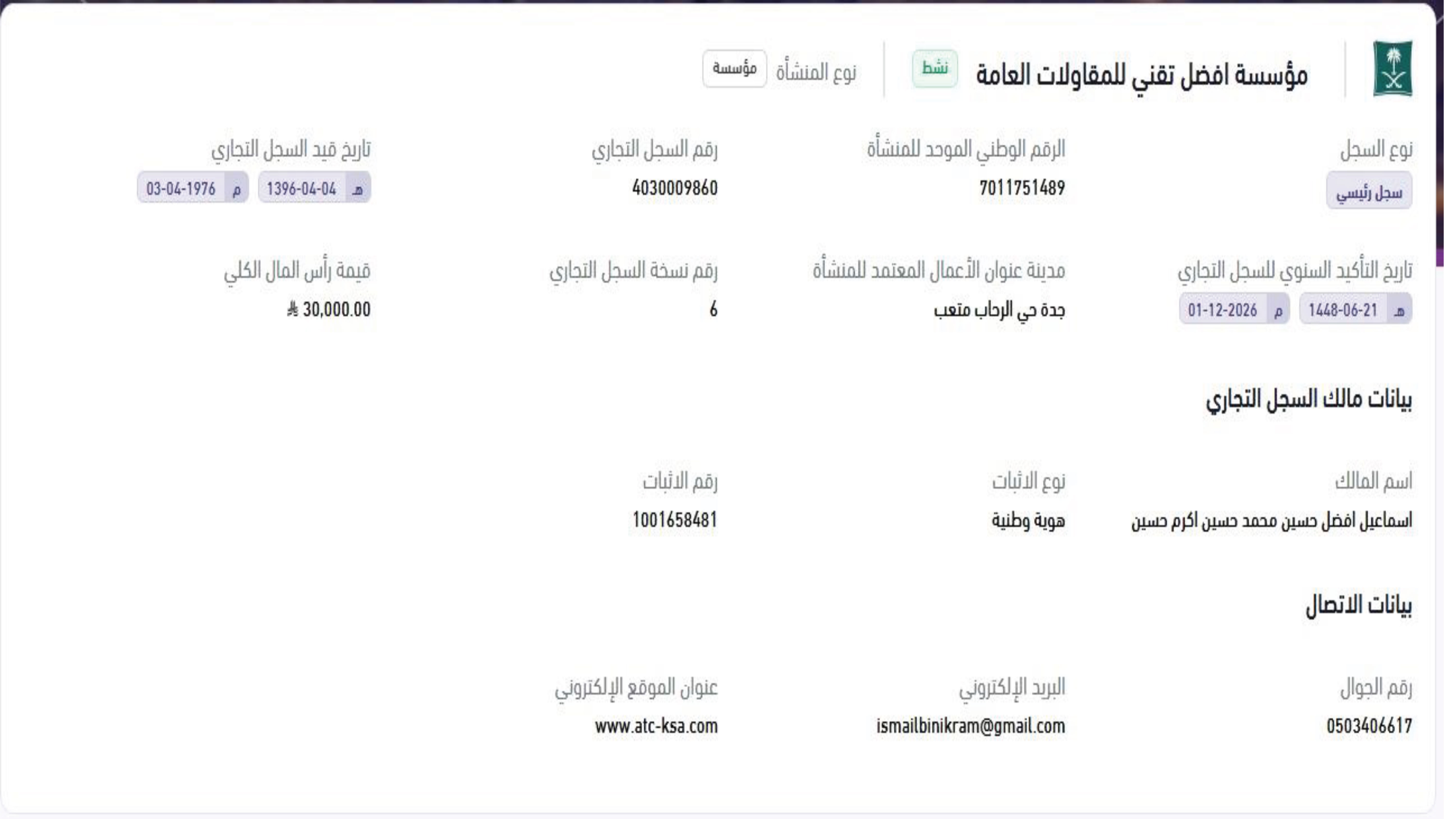 السجل التجاري:4030009860