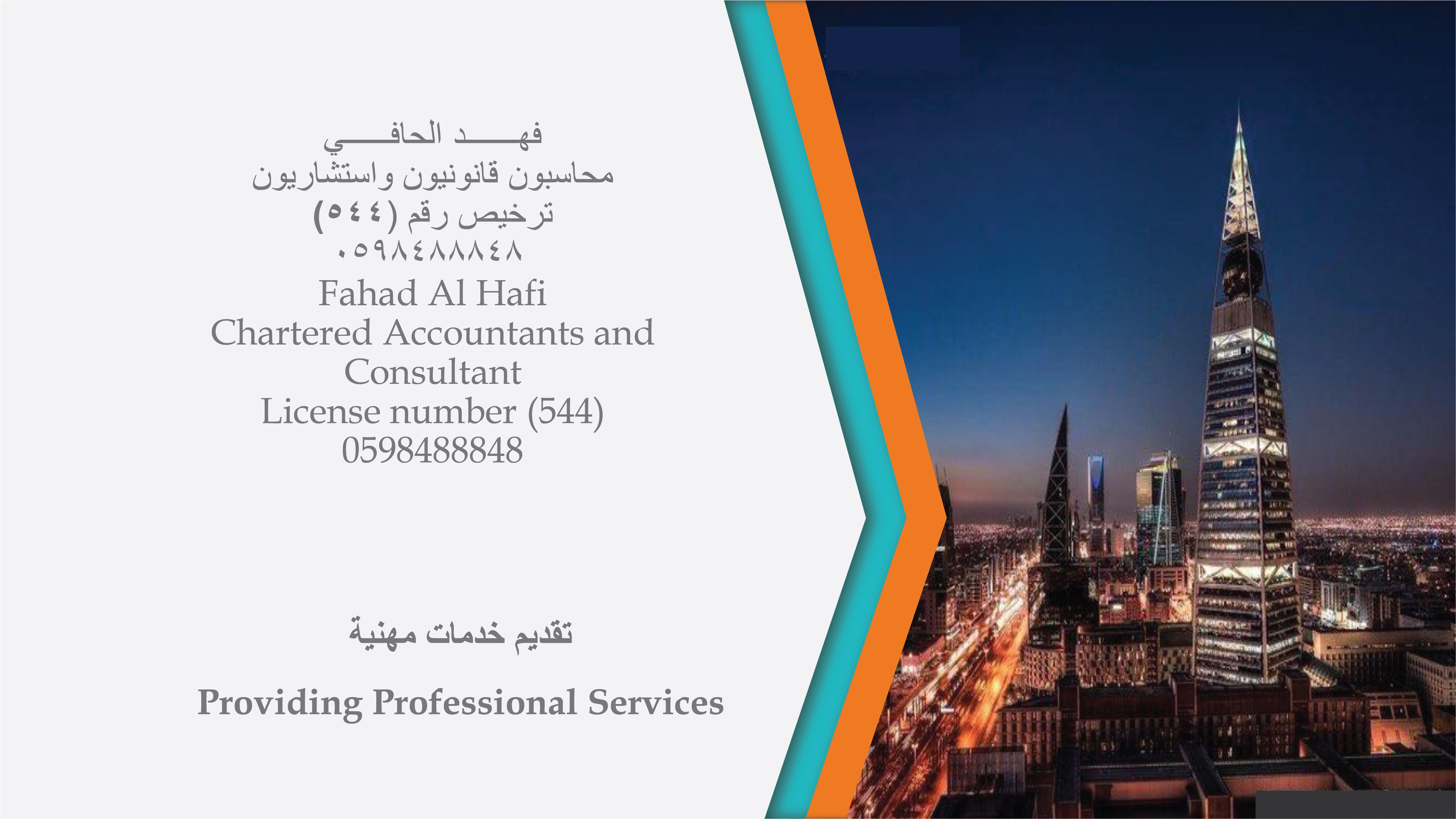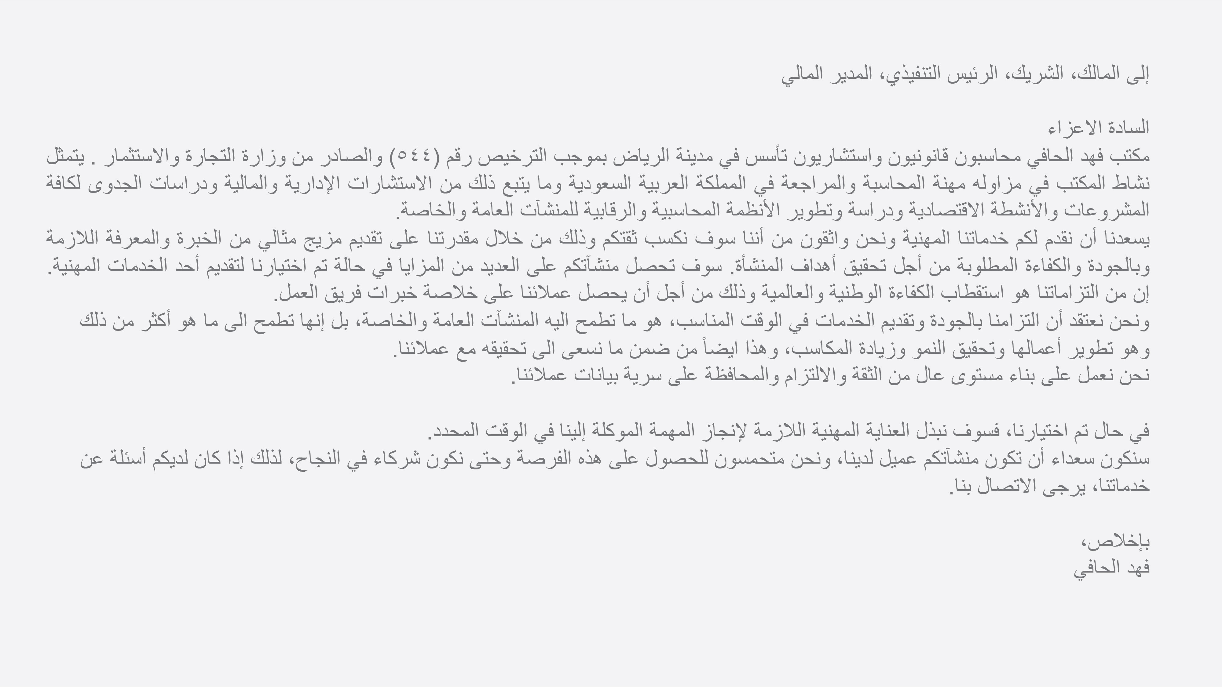 مكتب فهد الحافي محاسبون قانونيون واستشاريون تأسس في مدينة الرياض بموجب الترخيص رقم (٥٤٤) والصادر من وزارة التجارة والاستثمار . يتمثل نشاط المكتب في مزاولة مهنة المحاسبة والمراجعة في المملكة العربية السعودية وما يتبع ذلك من الاستشارات الإدارية والمالية ودراسات الجدوى لكافة المشروعات والأنشطة الاقتصادية ودراسة وتطوير الأنظمة المحاسبية والرقابية للمنشآت العامة والخاصة.