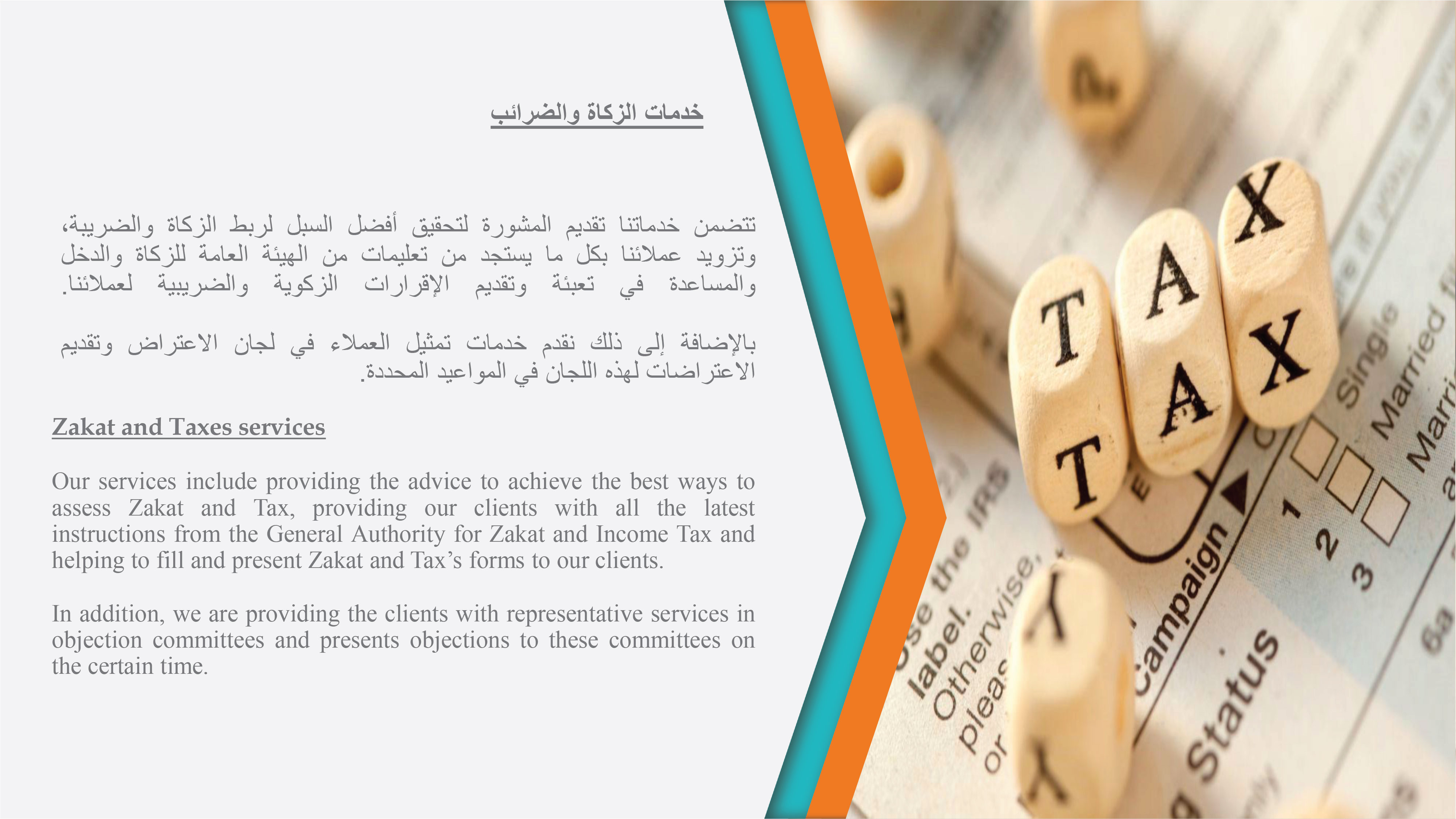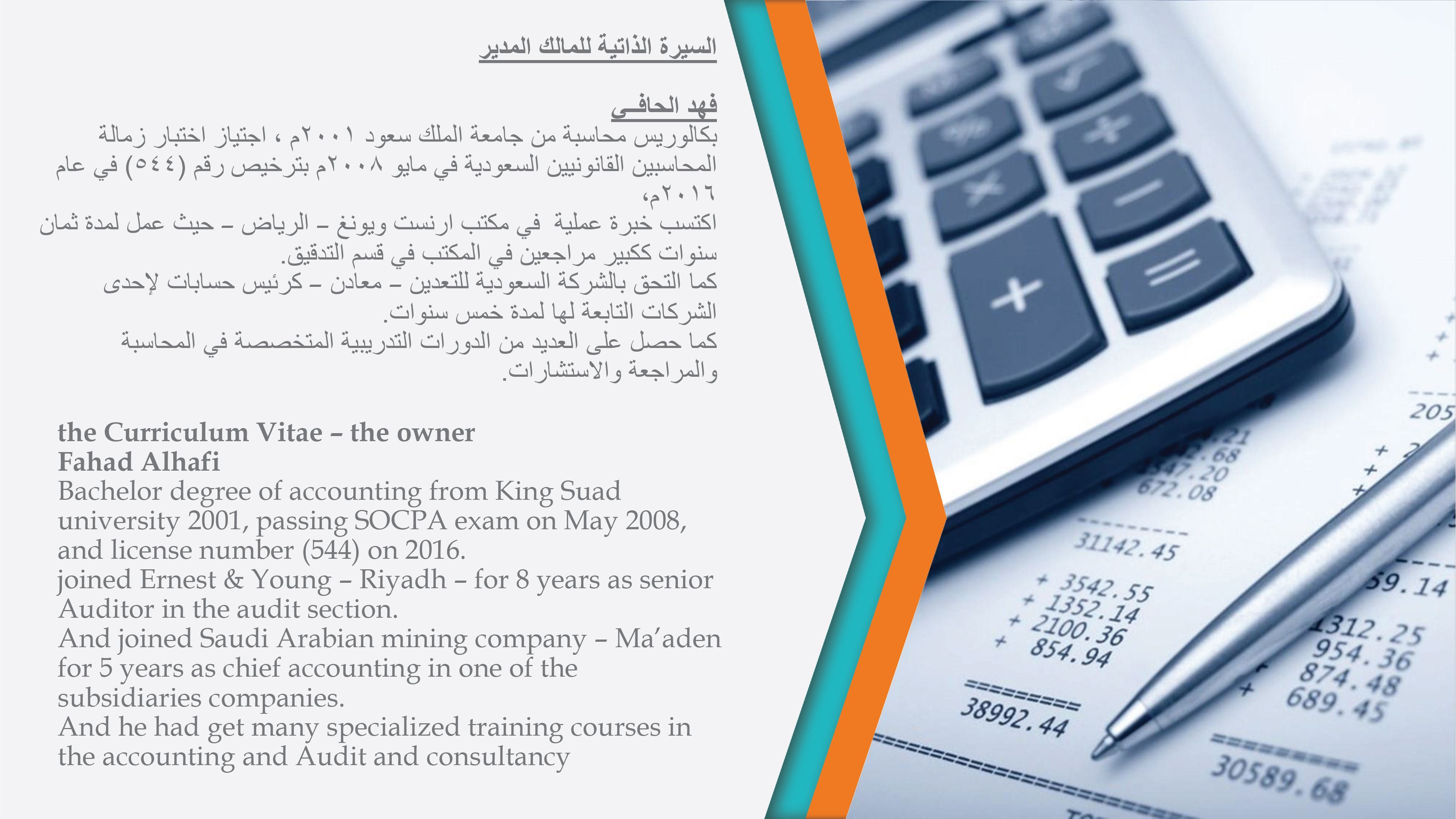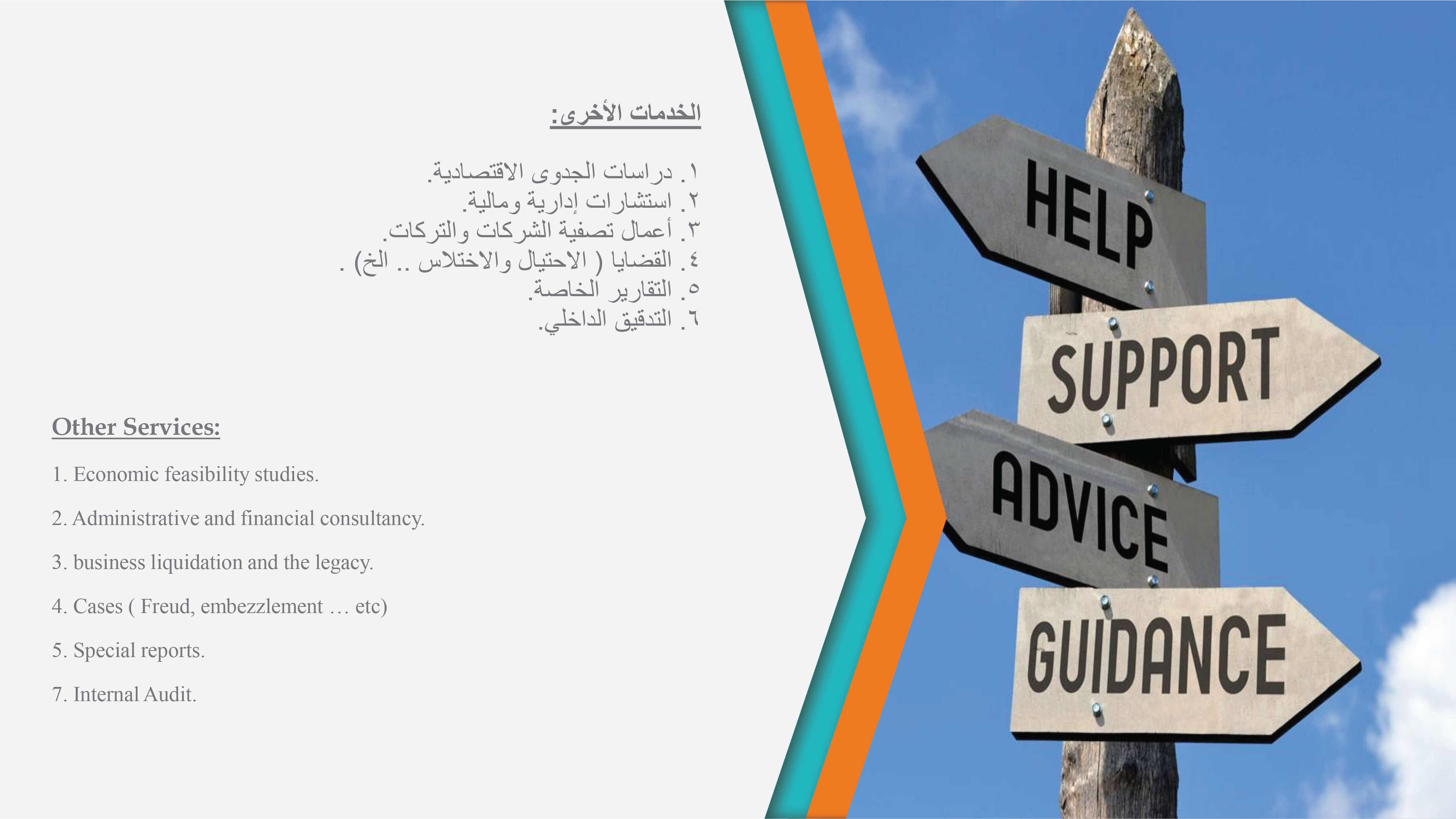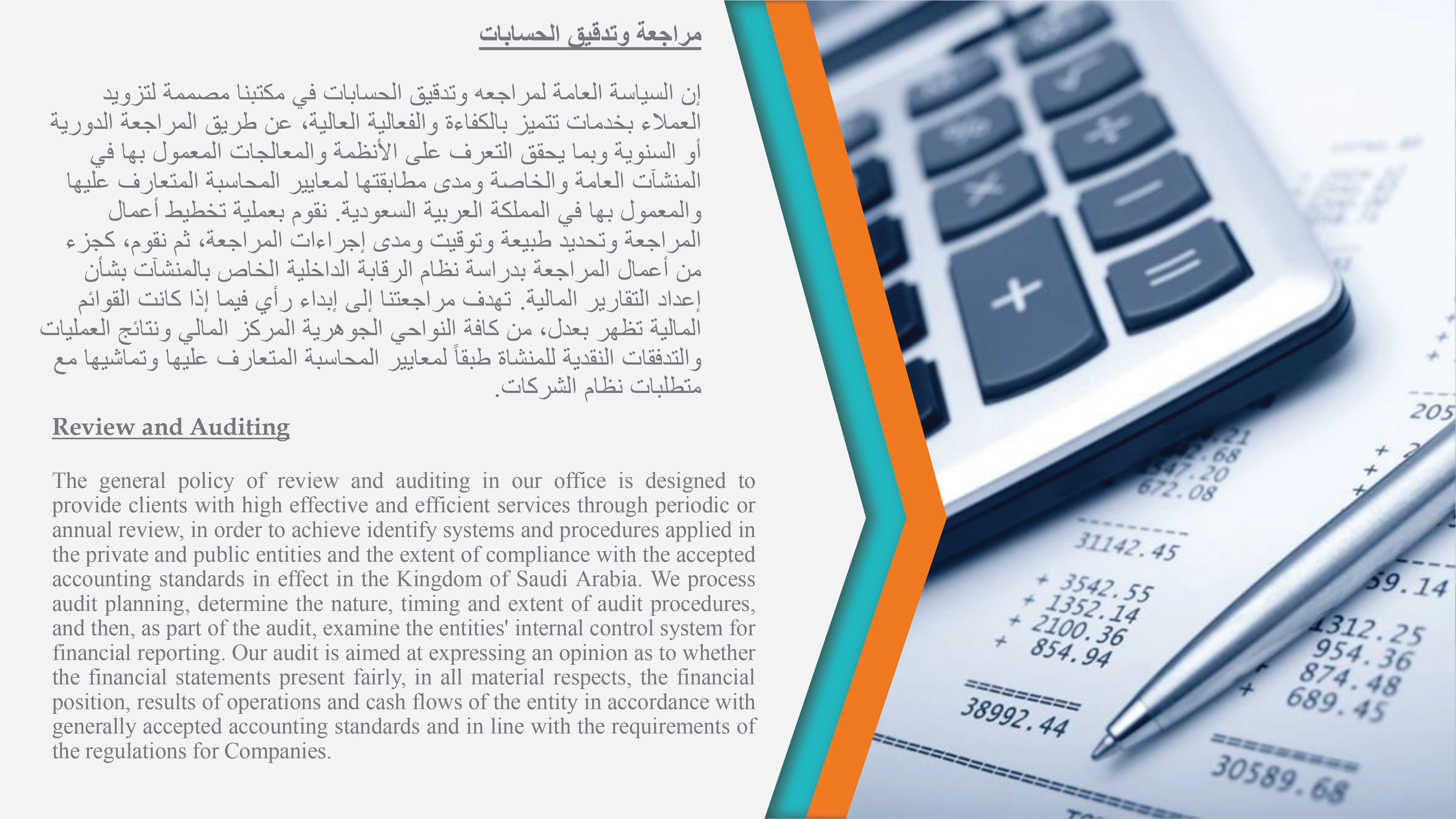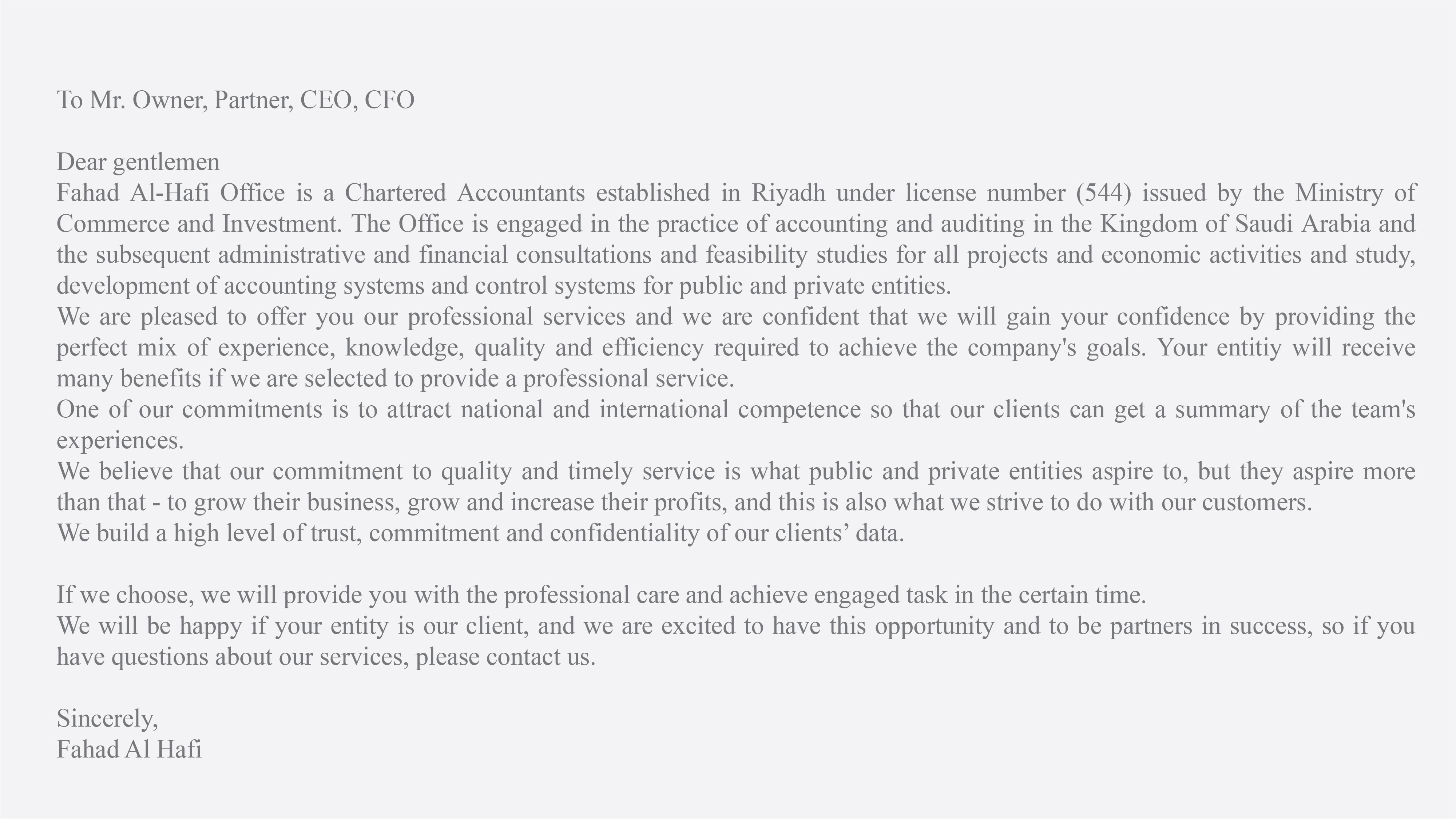 يسعدنا أن نقدم لكم خدماتنا المهنية ونحن واثقون من أننا سوف نكسب ثقتكم وذلك من خلال مقدرتنا على تقديم مزيج مثالي من الخبرة والمعرفة اللازمة وبالجودة والكفاءة المطلوبة من أجل تحقيق أهداف المنشأة. سوف تحصل منشآتكم على العديد من المزايا في حالة تم اختيارنا لتقديم أحد الخدمات المهنية. إن من التزاماتنا هو استقطاب الكفاءة الوطنية والعالمية وذلك من أجل أن يحصل عملائنا على خلاصة خبرات فريق العمل.