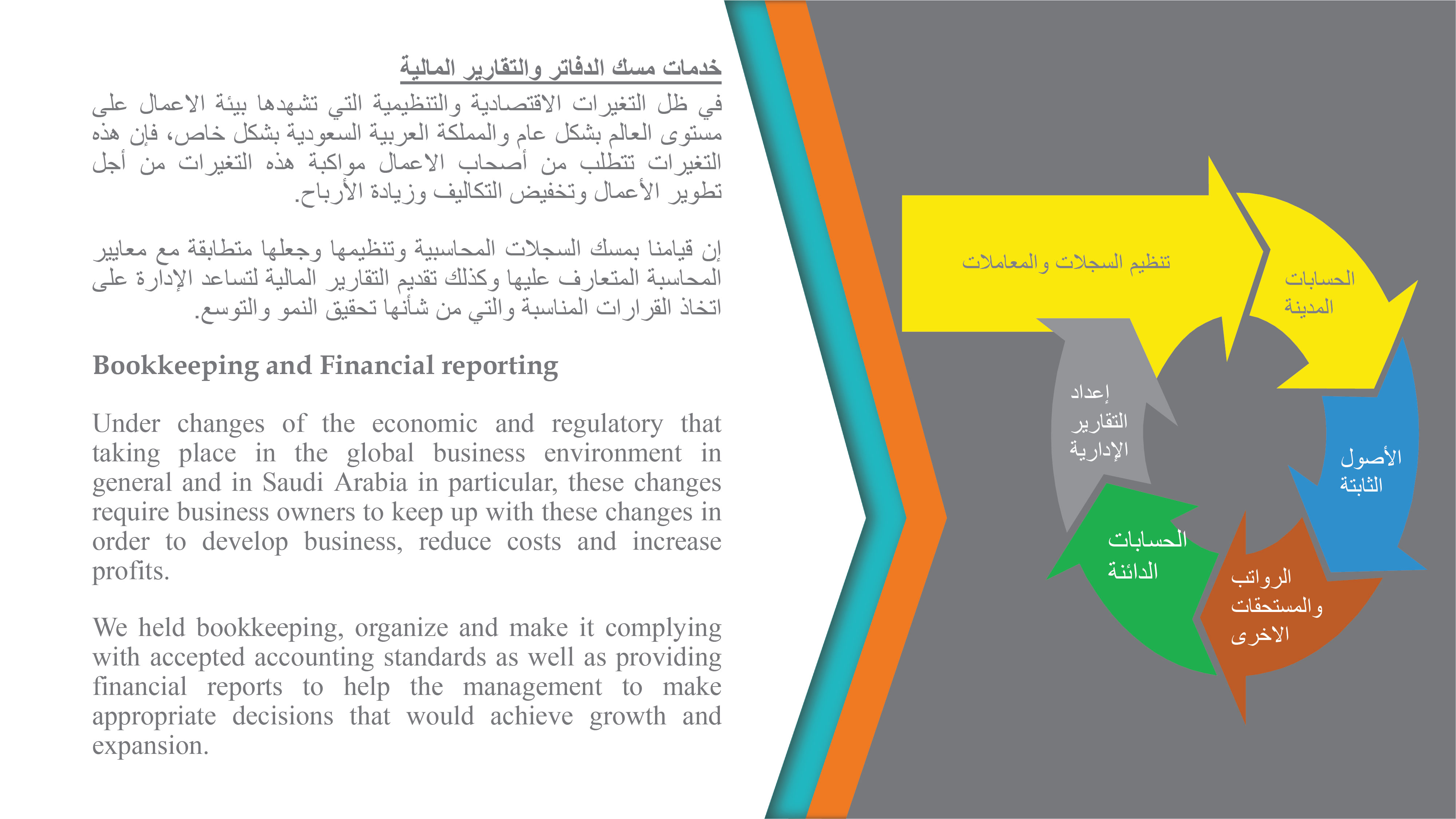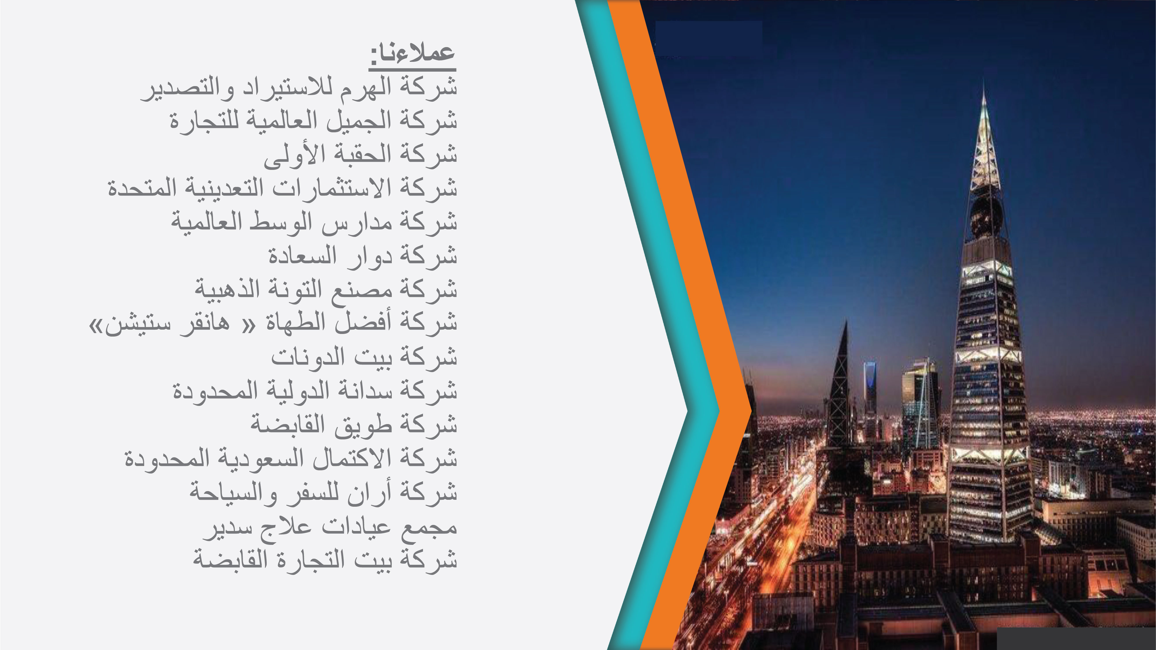 ونحن نعتقد أن التزامنا بالجودة وتقديم الخدمات في الوقت المناسب، هو ما تطمح اليه المنشآت العامة والخاصة، بل إنها تطمح الى ما هو أكثر من ذلك وهو تطوير أعمالها وتحقيق النمو وزيادة المكاسب، وهذا ايضاً من ضمن ما نسعى الى تحقيقه مع عملائنا.