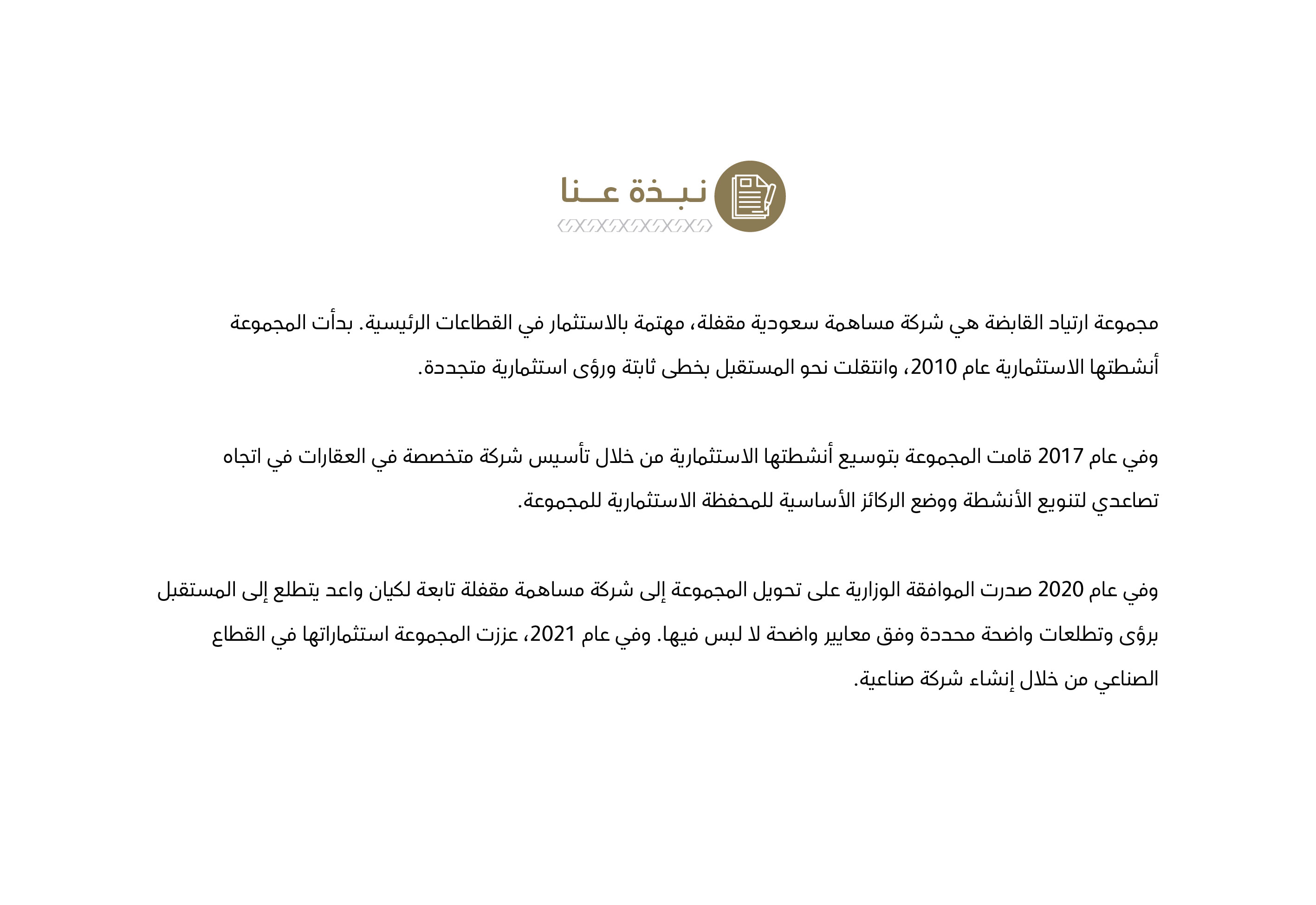 مجموعة ارتياد القابضة، هي شركة مساهمة سعودية مقفلة، بدأت نواتها الاستثمارية في قطاع المقاولات منذ عام 2017م، ومضت نحو المستقبل بخطى ثابتة ورؤى استثمارية متجددة، حيث قامت في عام 2014م بتشكيل اللبنة الأولى لمحفظتها الاستثمارية والتي كانت عبر الاستثمار في القطاع المالي، والذي يُعد مكونا رئيسيا للمحفظة الاستثمارية التابعة للمجموعة، والانطلاقة كانت بالاستثمار في قطاع التمويل بمؤسسة مرخصة من قبل وزارة التجارة والاستثمار، لتتوسع في عام 2017م الأنشطة الاستثمارية بتأسيس شركة للاستشارات المالية بالإضافة إلى شركة عقارية، في منحى تصاعدي لتنويع الأنشطة وتكوين ركائز أساسية في محفظة المجموعة الاستثمارية.
