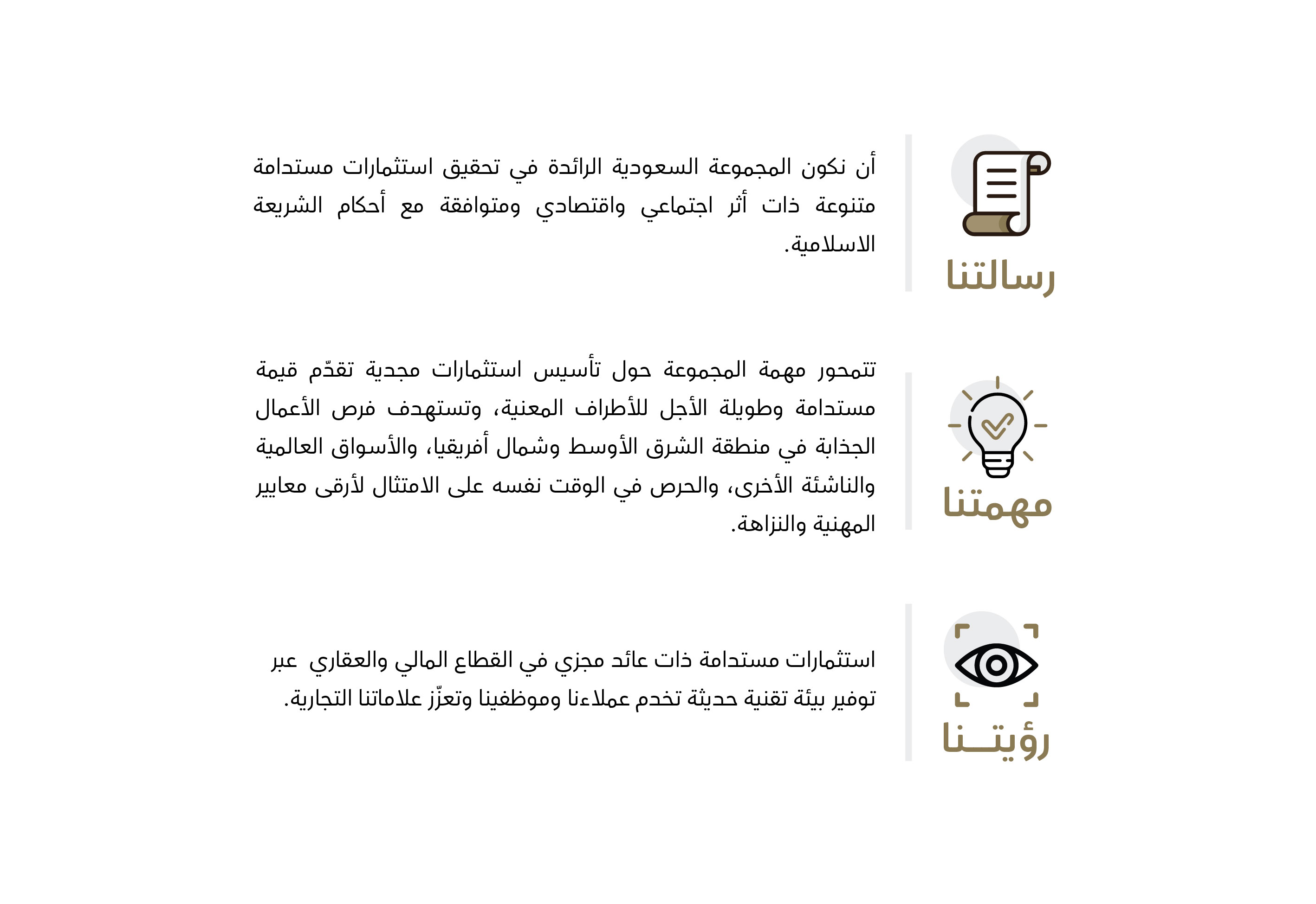وبدءا من عام 2018م بدأ التحول نحو العمل المؤسسي لمواكبة رؤية المملكة 2030 الرامية إلى إحداث نقلة نوعية في جميع القطاعات الحيوية، مما حدا بالمجموعة إلى تحويل شركة الاستشارات المالية إلى مجموعة قابضة تنشط في السوق المالي السعودي بخبرات مالية لا يمكن أن تجتمع إلا في عدة شركات مالية كبرى.