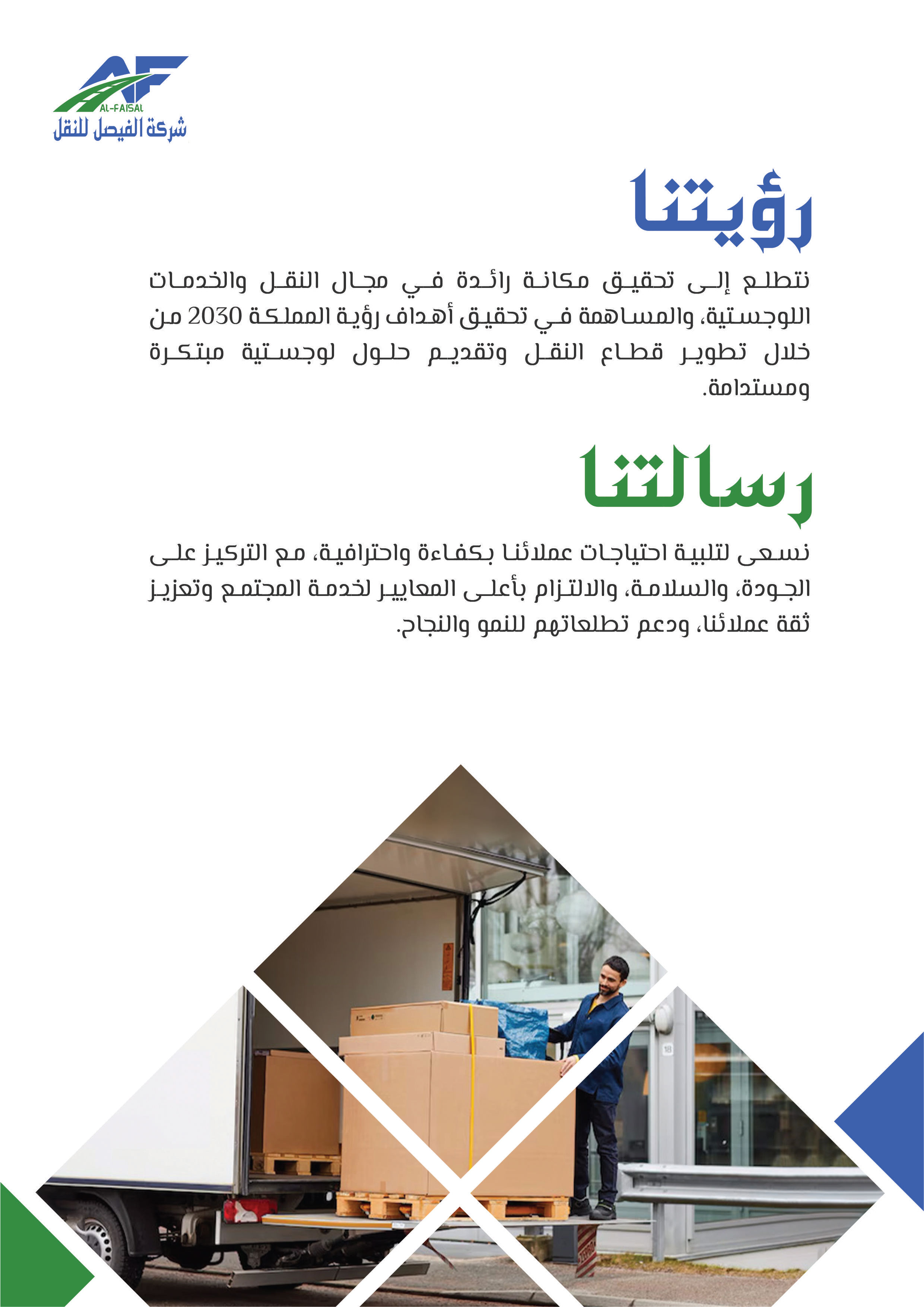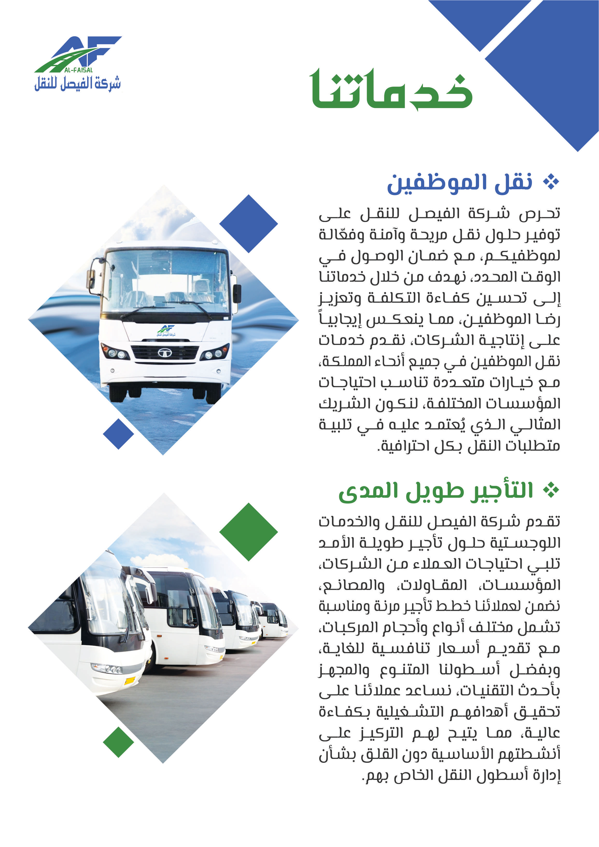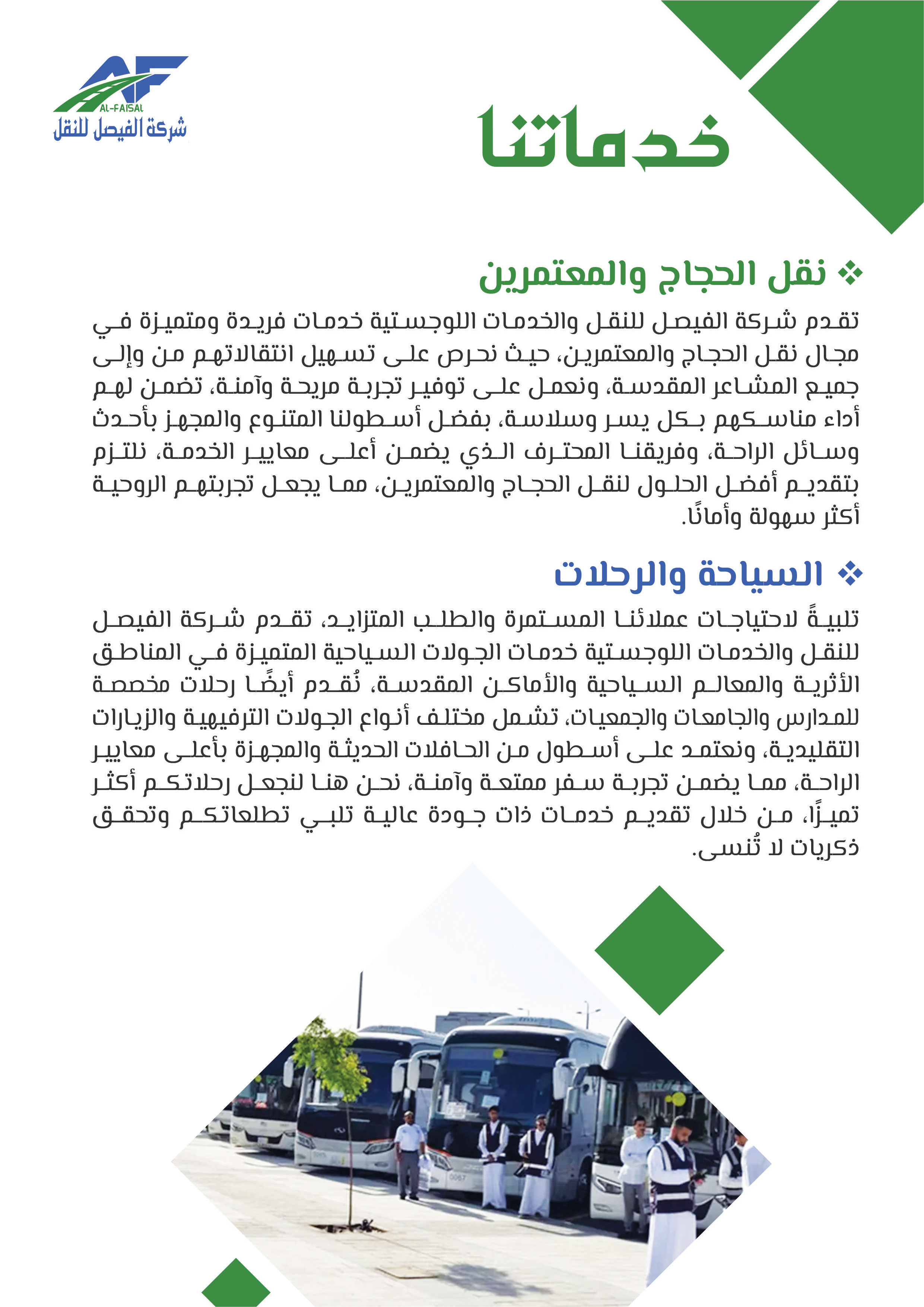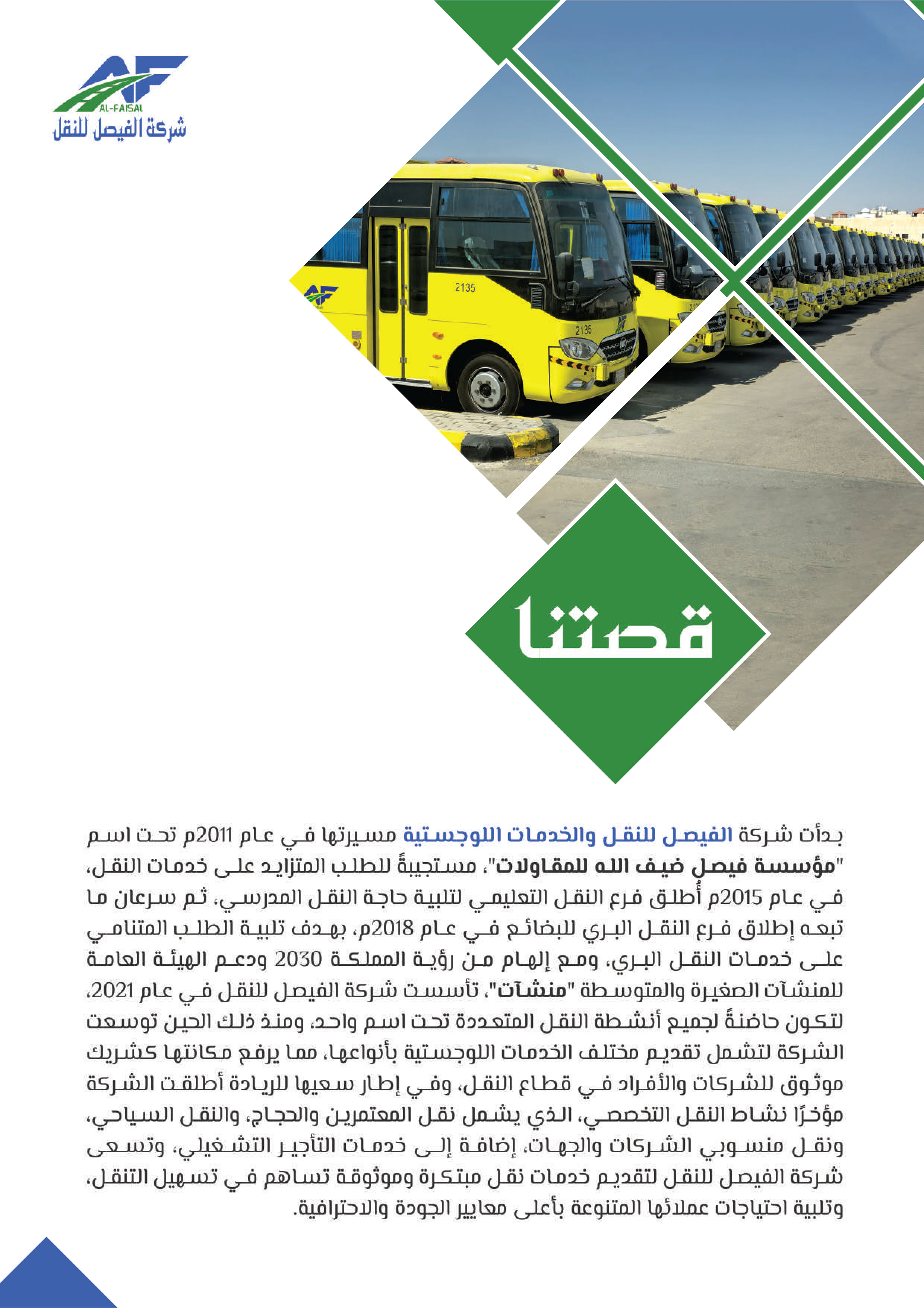 بدأت شركة الفيصل للنقل والخدمات اللوجستية مسيرتها في عام 2011م تحت اسم "مؤسسة فيصل ضيف الله للمقاولات"، مستجيبة للطلب المتزايد على خدمات النقل في عام 2015م أطلق فرع النقل التعليمي لتلبية حاجة النقل المدرسي، ثم سرعان ما تبعه إطلاق فرع النقل البري للبضائع في عام 2018، بهدف تلبية الطلب المتنامي على خدمات النقل البري، ومع إلهام من رؤية المملكة 2030 ودعم الهيئة العامة للمنشآت الصغيرة والمتوسطة "منشآت"، تأسست شركة الفيصل للنقل في عام 2021 لتكون حاضنة لجميع أنشطة النقل المتعددة تحت اسم واحد، ومنذ ذلك الحين توسعت الشركة لتشمل تقديم مختلف الخدمات اللوجستية بأنواعها، مما يرفع مكانتها كشريك موثوق للشركات والأفراد في قطاع النقل، وفي إطار سعيها للريادة أطلقت الشركة مؤخرًا نشاط النقل التخصصي، الذي يشمل نقل المعتمرين والحجاج، والنقل السياحي ونقل منسوبي الشركات والجهات، إضافة إلى خدمات التأجير التشغيلي، وتسعى شركة الفيصل للنقل لتقديم خدمات نقل مبتكرة وموثوقة تساهم في تسهيل التنقل وتلبية احتياجات عملائها المتنوعة بأعلى معايير الجودة والاحترافية.
