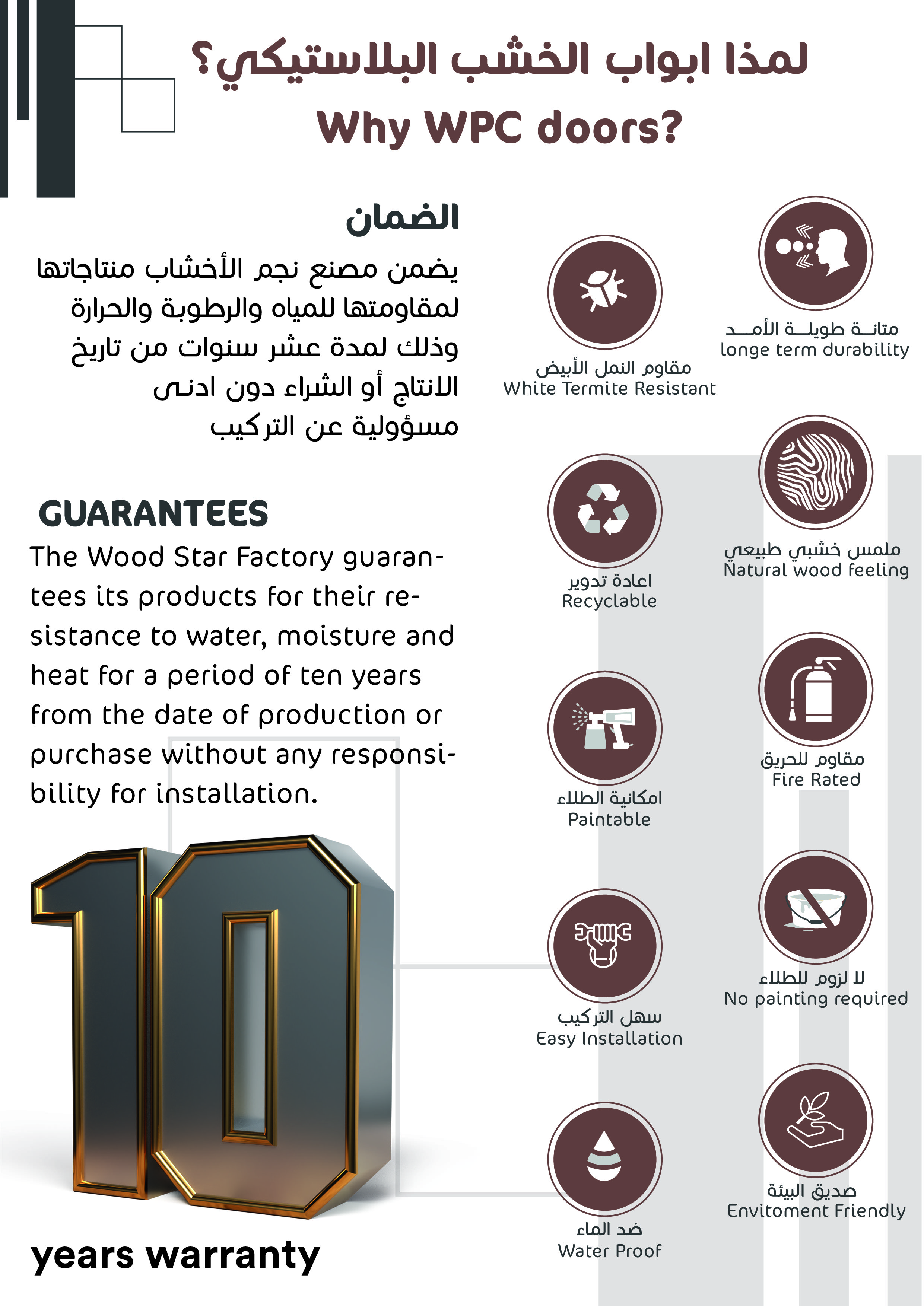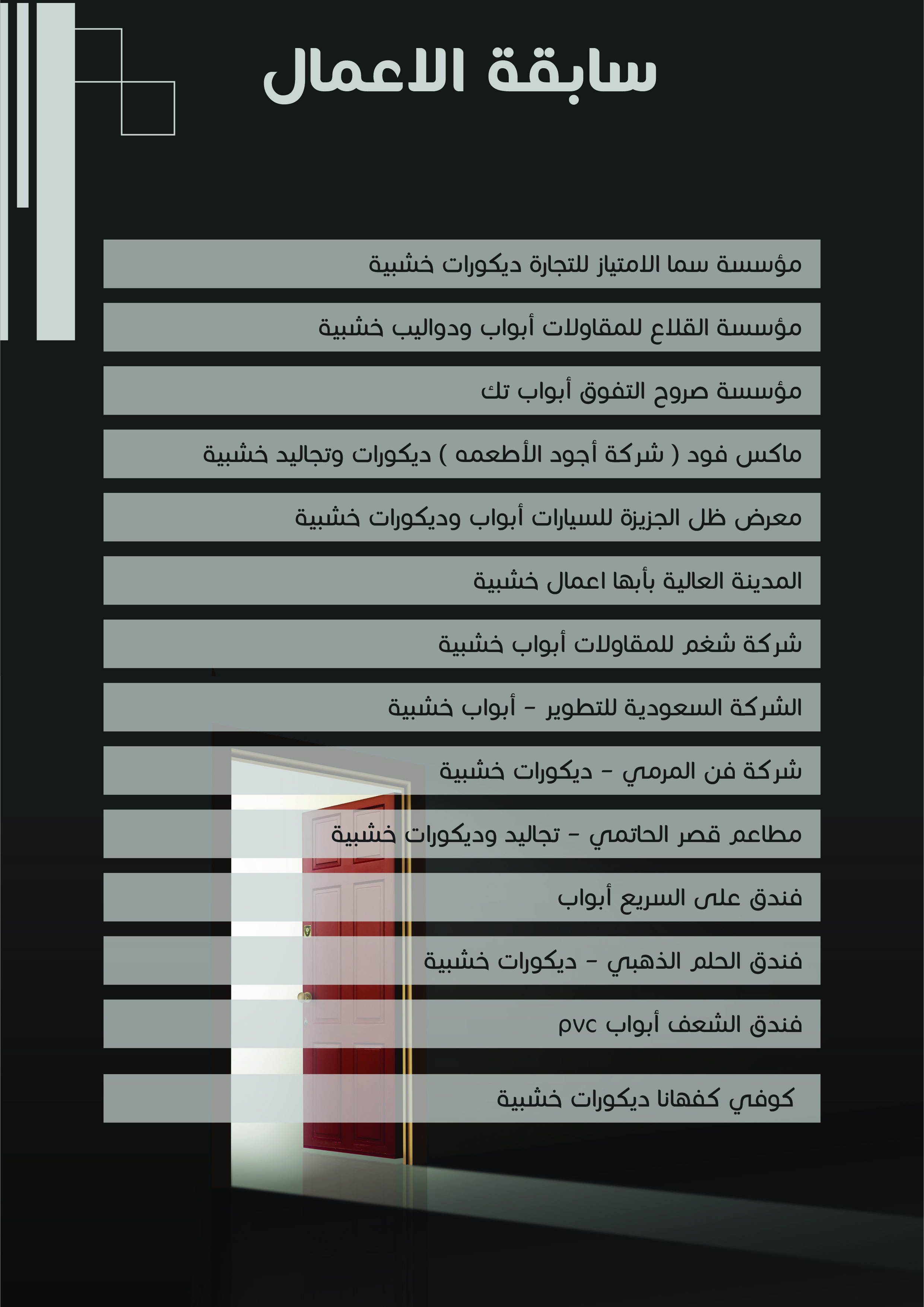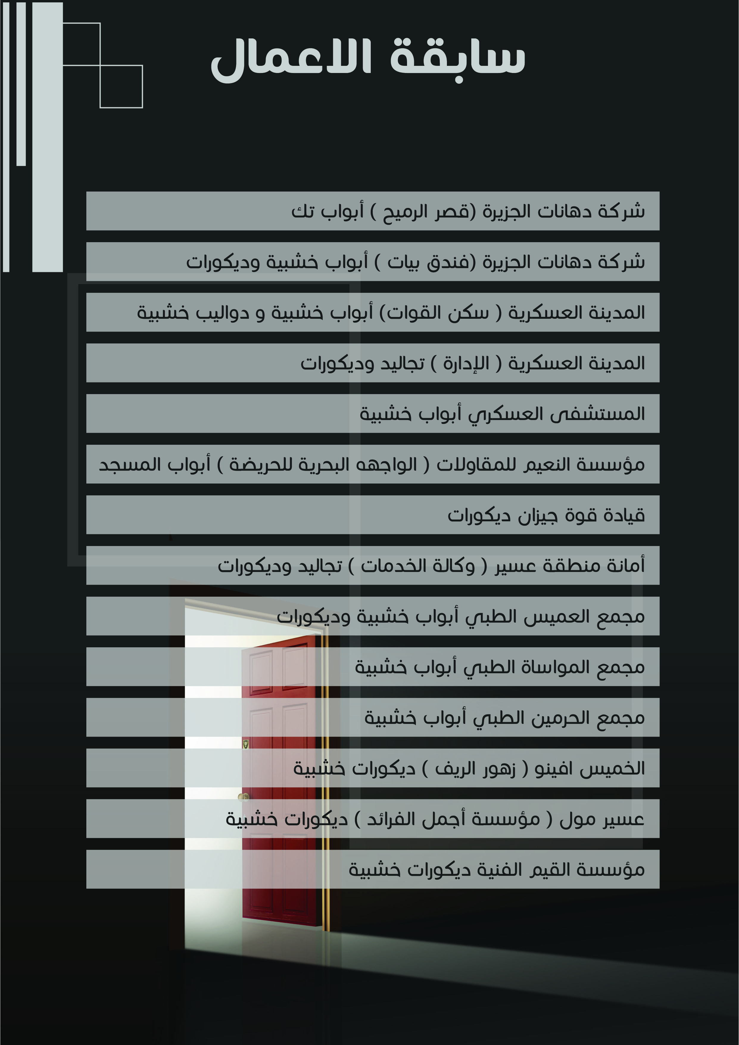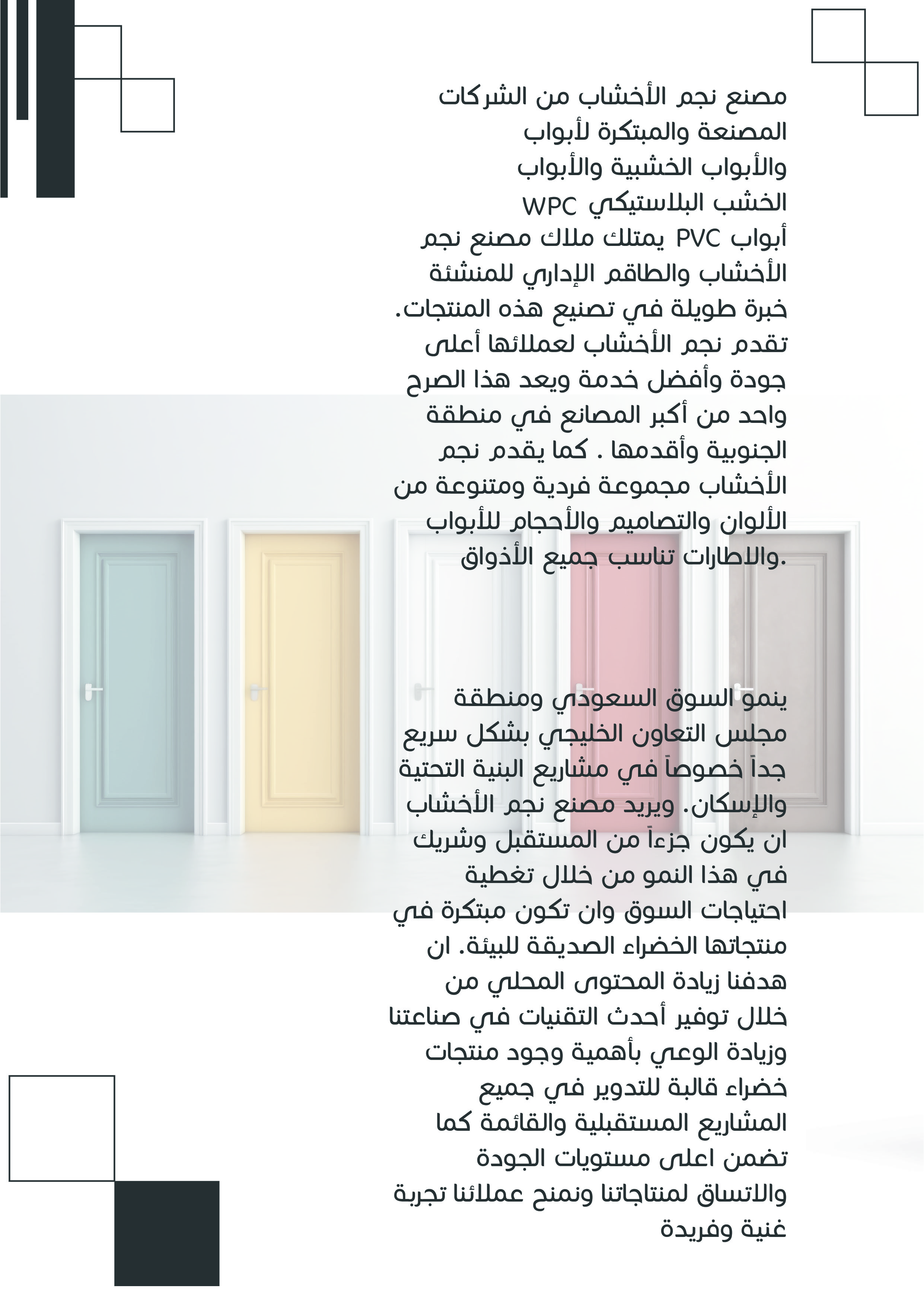 يمتلك ملاك مصنع نجم الأخشاب والطاقم الإداري للمنشئة خبرة طويلة في تصنيع هذه المنتجات. تقدم نجم الأخشاب لعملائها أعلى جودة وأفضل خدمة ويعد هذا الصرحواحد من أكبر المصانع في منطقة الجنوبية وأقدمها . كما يقدم نجم الأخشاب مجموعة فردية ومتنوعة من الألوان والتصاميم والأحجام للأبواب . والاطارات تناسب جميع الأذواق